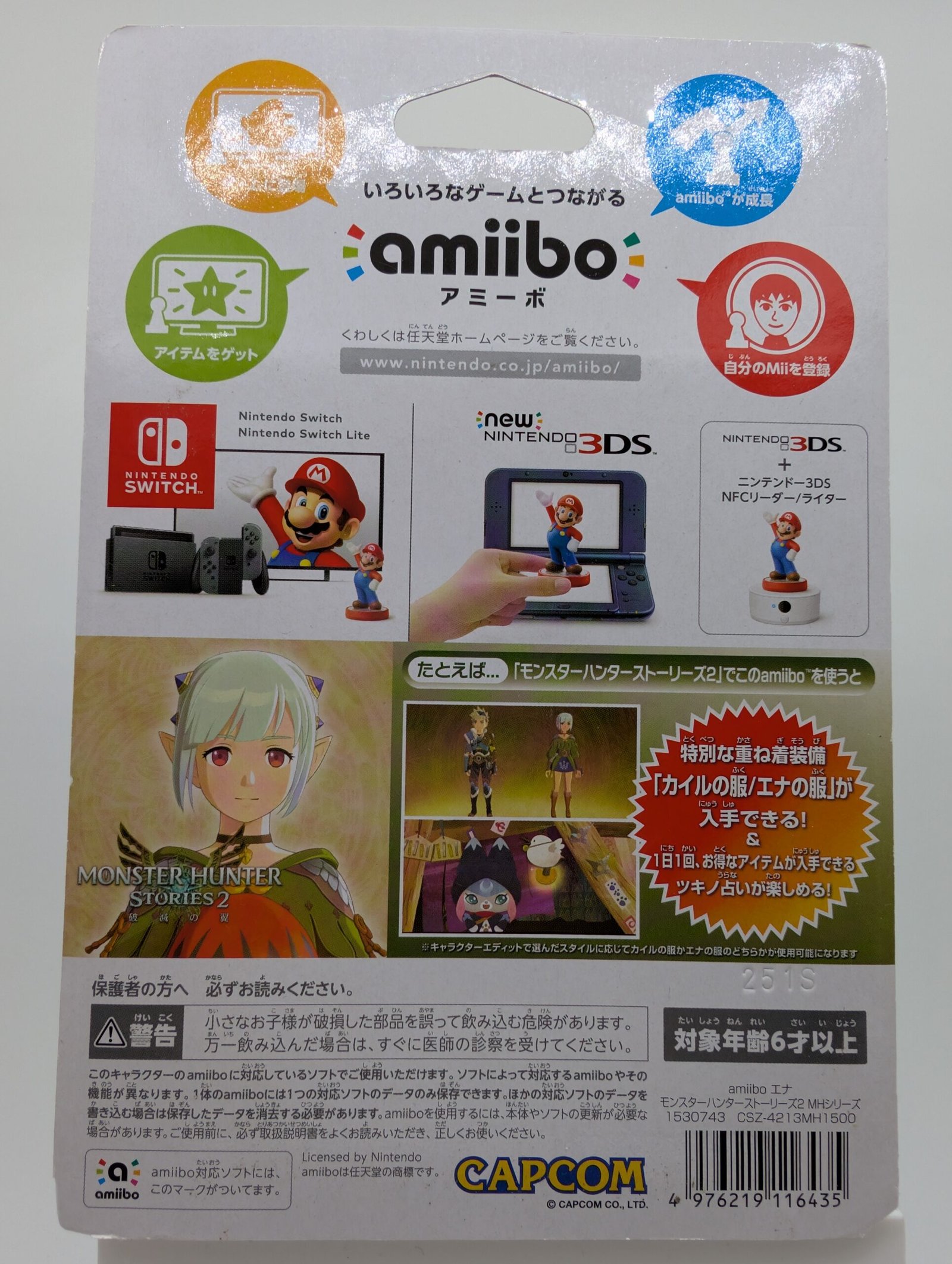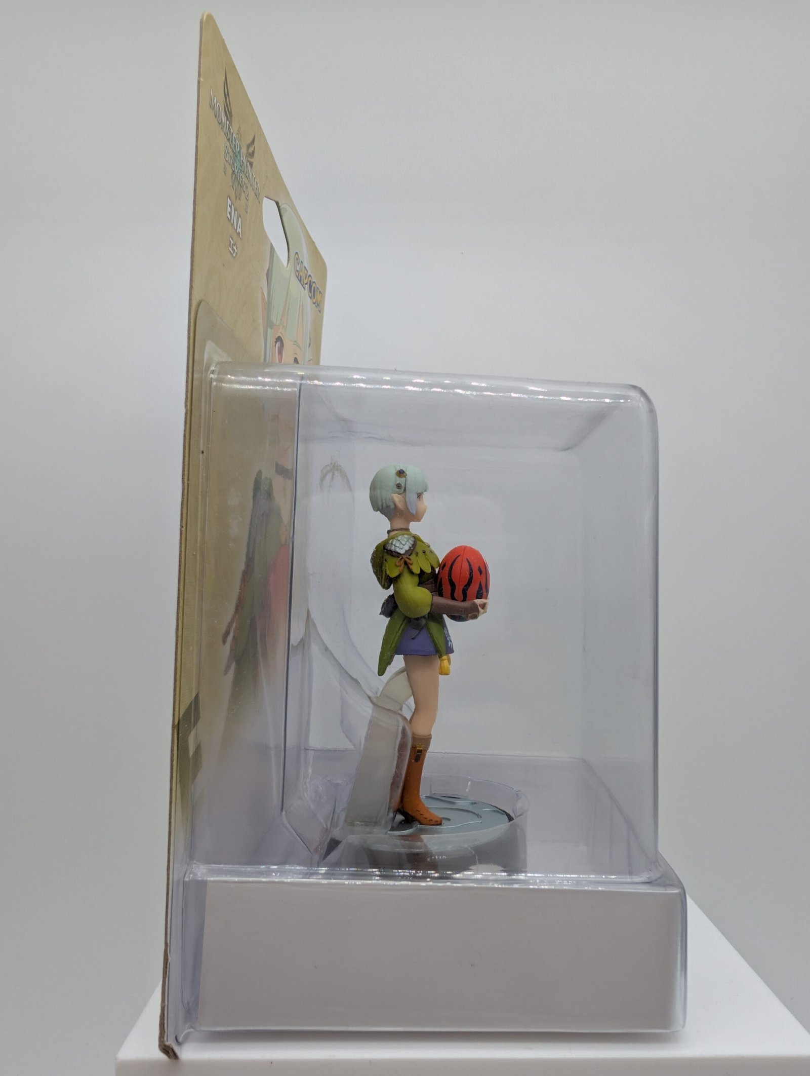 La figura de amiibo, perteneciente a la colección Monster Hunter Stories 2, presenta al personaje Ena, con diseño detallado pensado tanto para exhibición como para uso con tecnología NFC compatible.