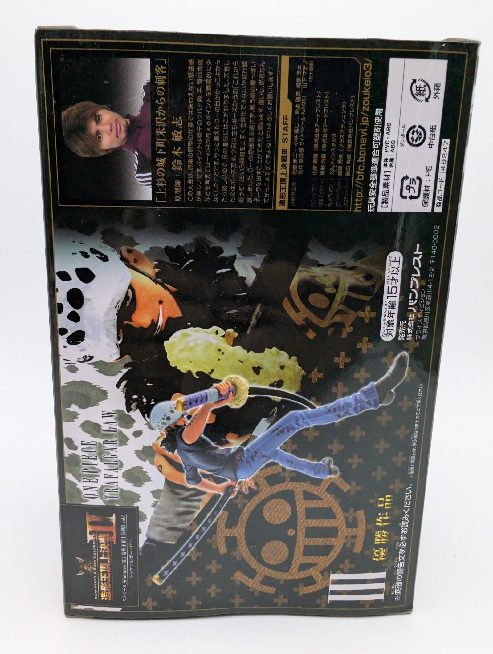 ¡Añade un toque de maestría a tu vitrina! Banpresto presenta la figura compacta de Trafalgar Law de la serie One Piece. Con un tamaño de 16 cm, esta pieza impresiona por su meticuloso esculpido y diseño artístico, convirtiéndose en una adición de alta calidad y el tamaño perfecto para cualquier coleccionista.