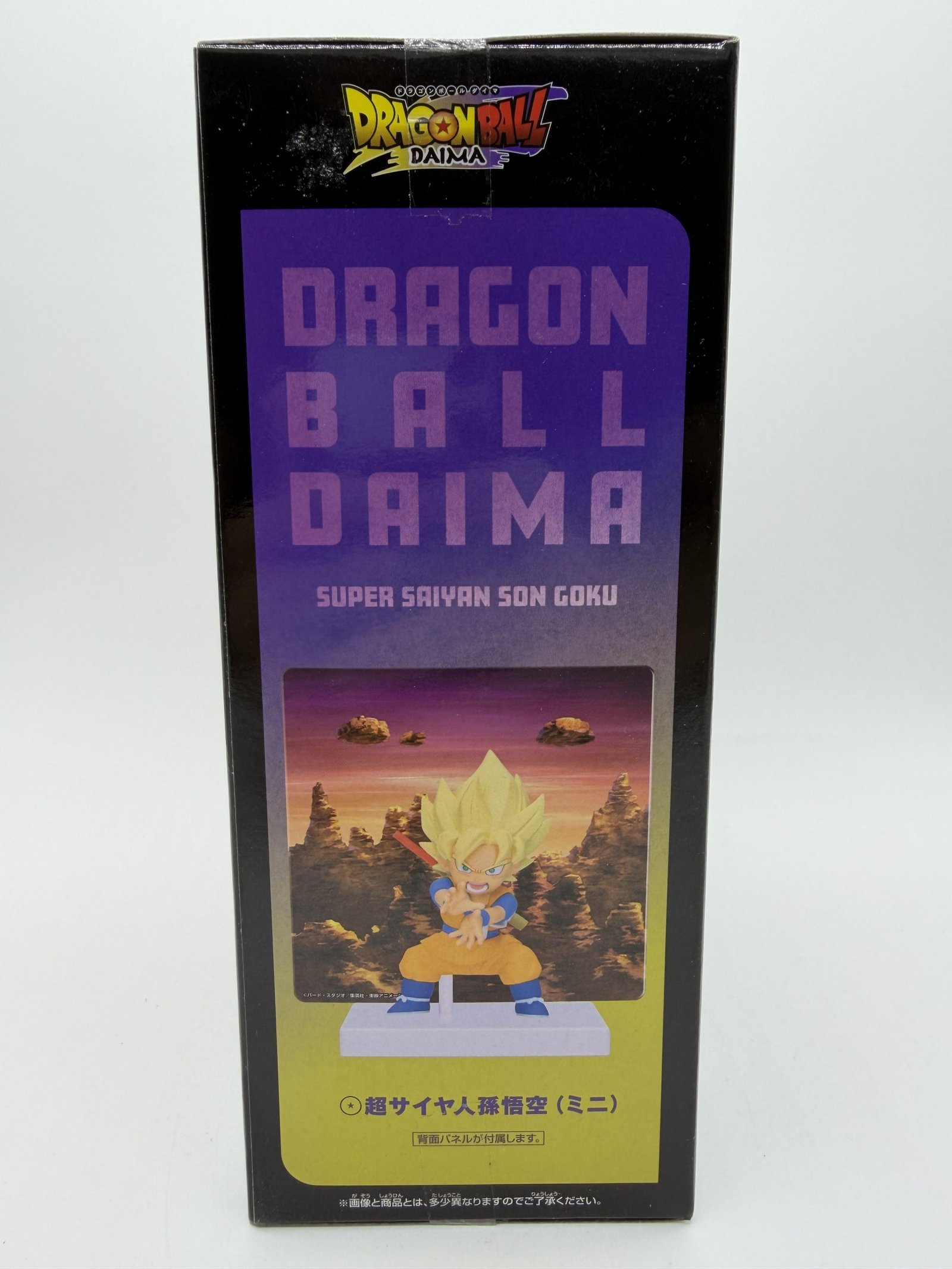 La figura de Banpresto de la línea Dragon Ball Series presenta la versión Mini de Super Saiyan Son Goku, inspirada en Dragon Ball DAIMA, con un diseño compacto y fiel al estilo del anime, acompañada por un panel de fondo que permite recrear una escena del Reino Demoníaco.