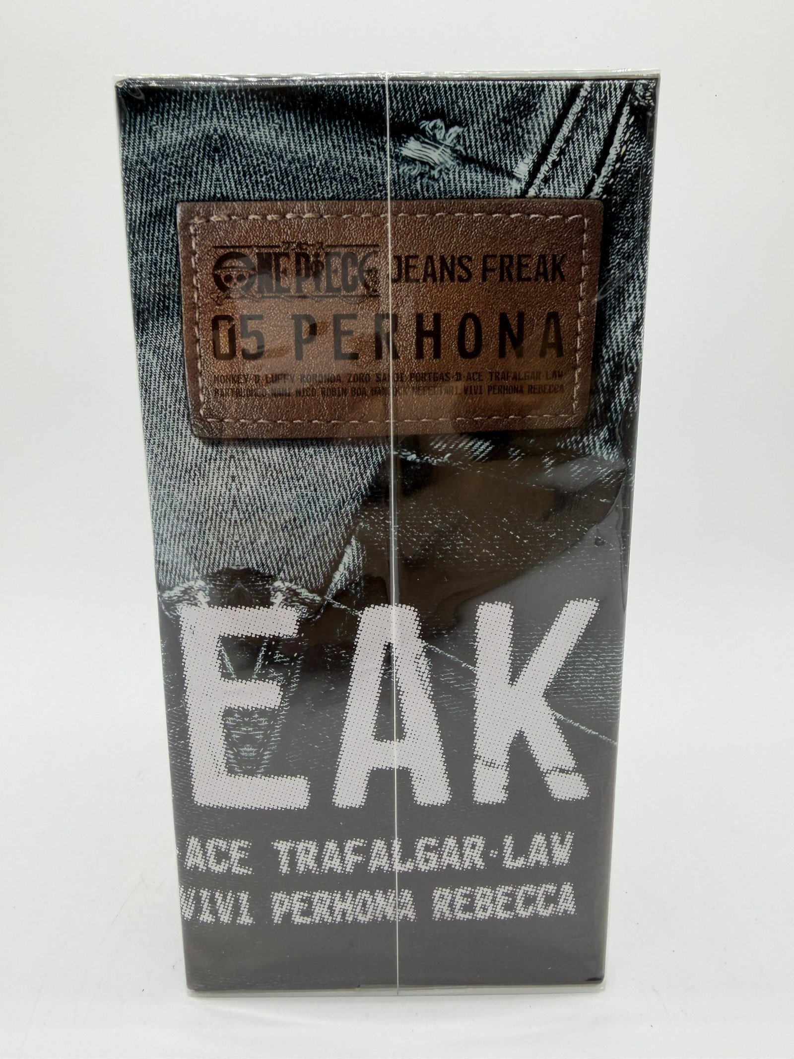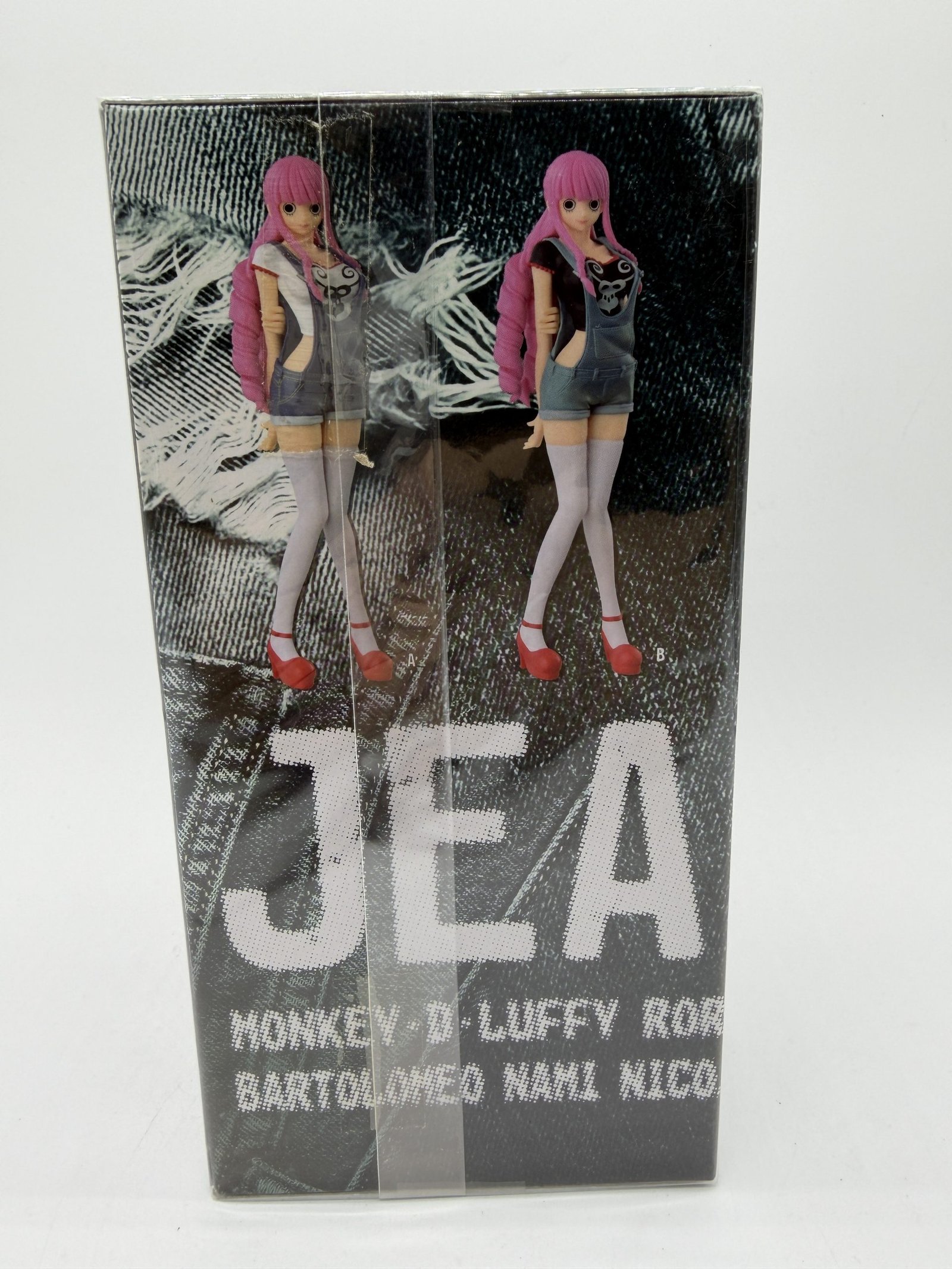 La figura de Banpresto de la línea DXF Jeans Freak presenta a Perona Fig. 5 Versión B (Special Color) con camiseta negra y detalles en gris, luciendo un estilo de jeans único dentro de la colección One Piece. Cada detalle captura su personalidad y el diseño especial que la hace destacar.