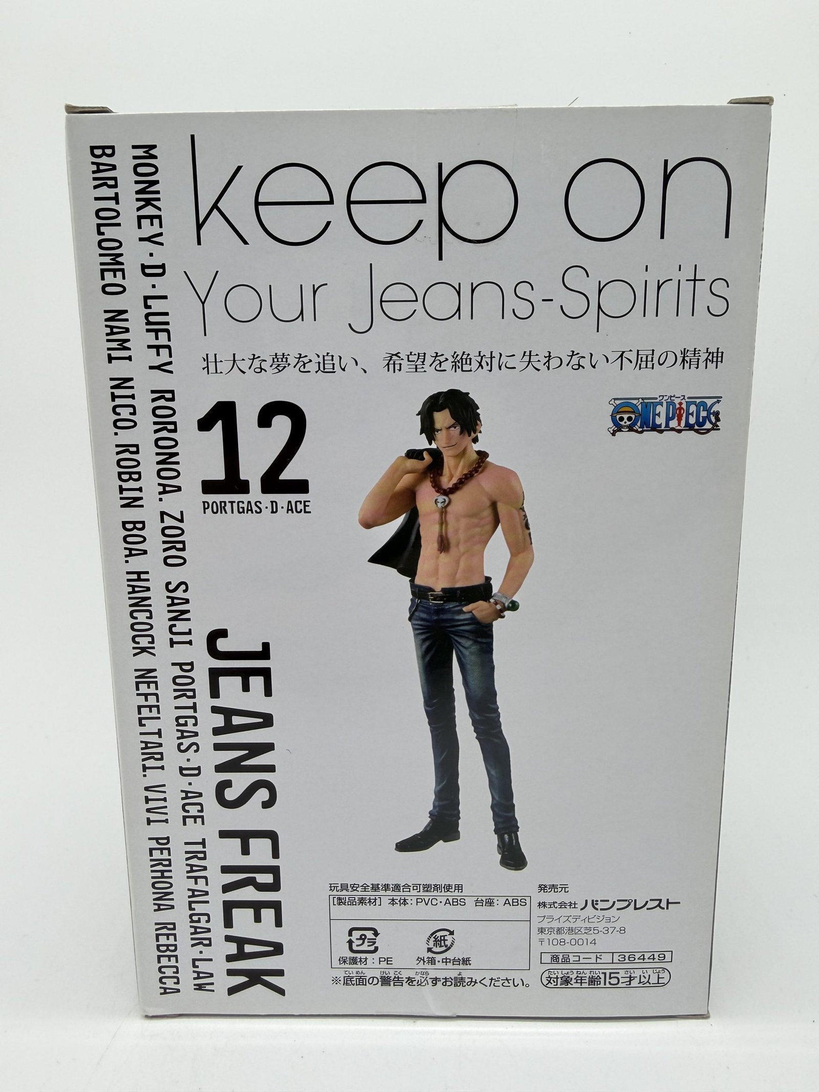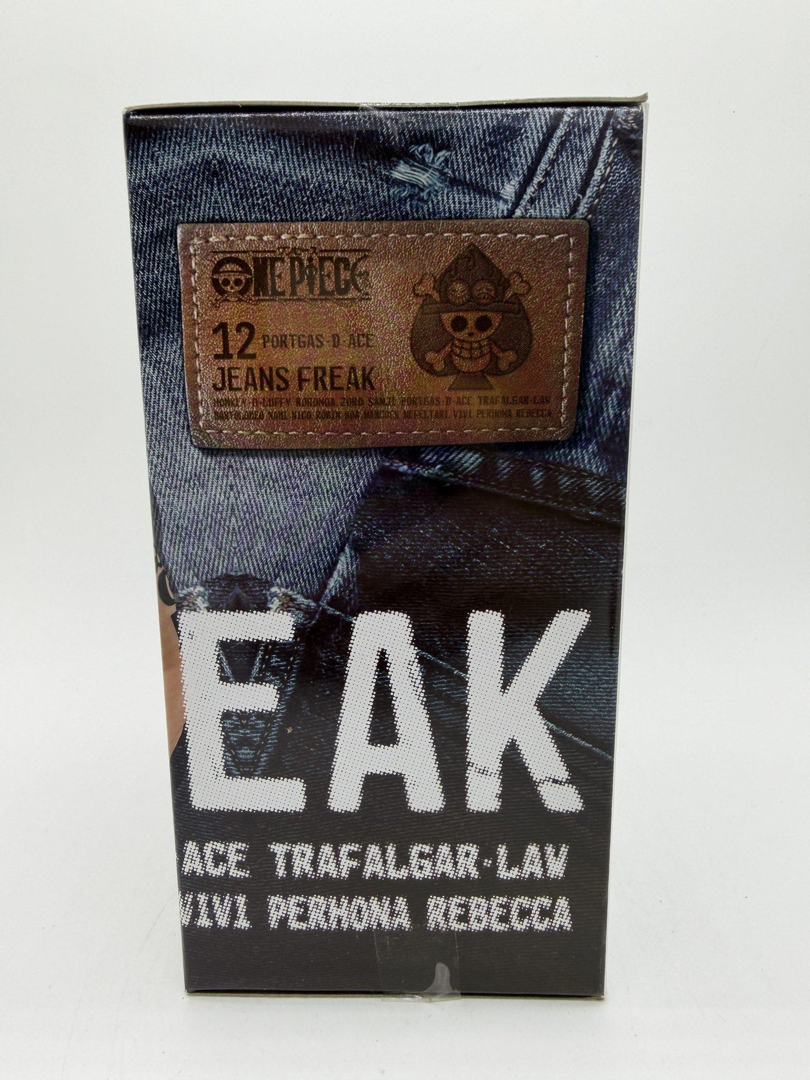 La figura de Banpresto, de la línea DXF Jeans Freak, presenta a Portgas D. Ace en su Fig.12 Versión B dentro de la colección One Piece, con un estilo urbano que lo muestra vistiendo un pantalón de jean azul y una chaqueta negra al hombro. Una pieza que destaca el carácter relajado del personaje con una estética moderna dentro de esta colección.