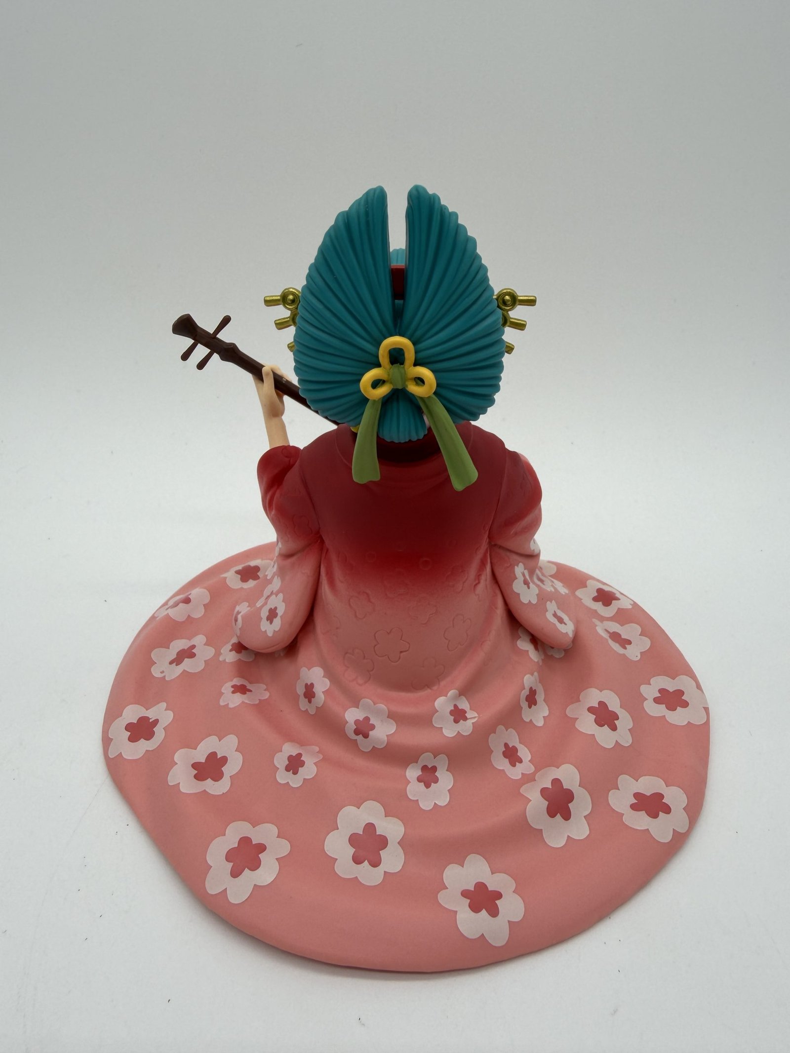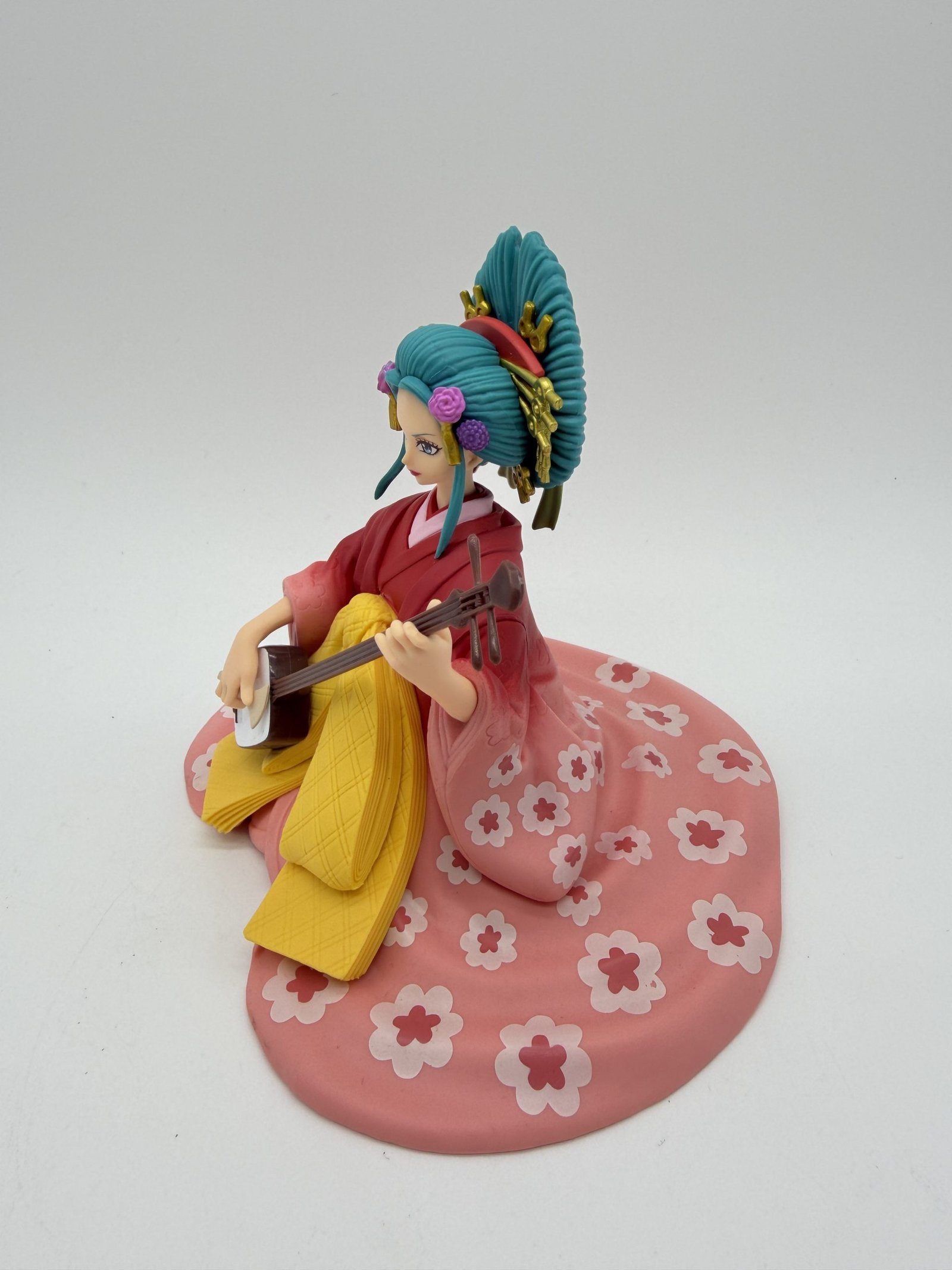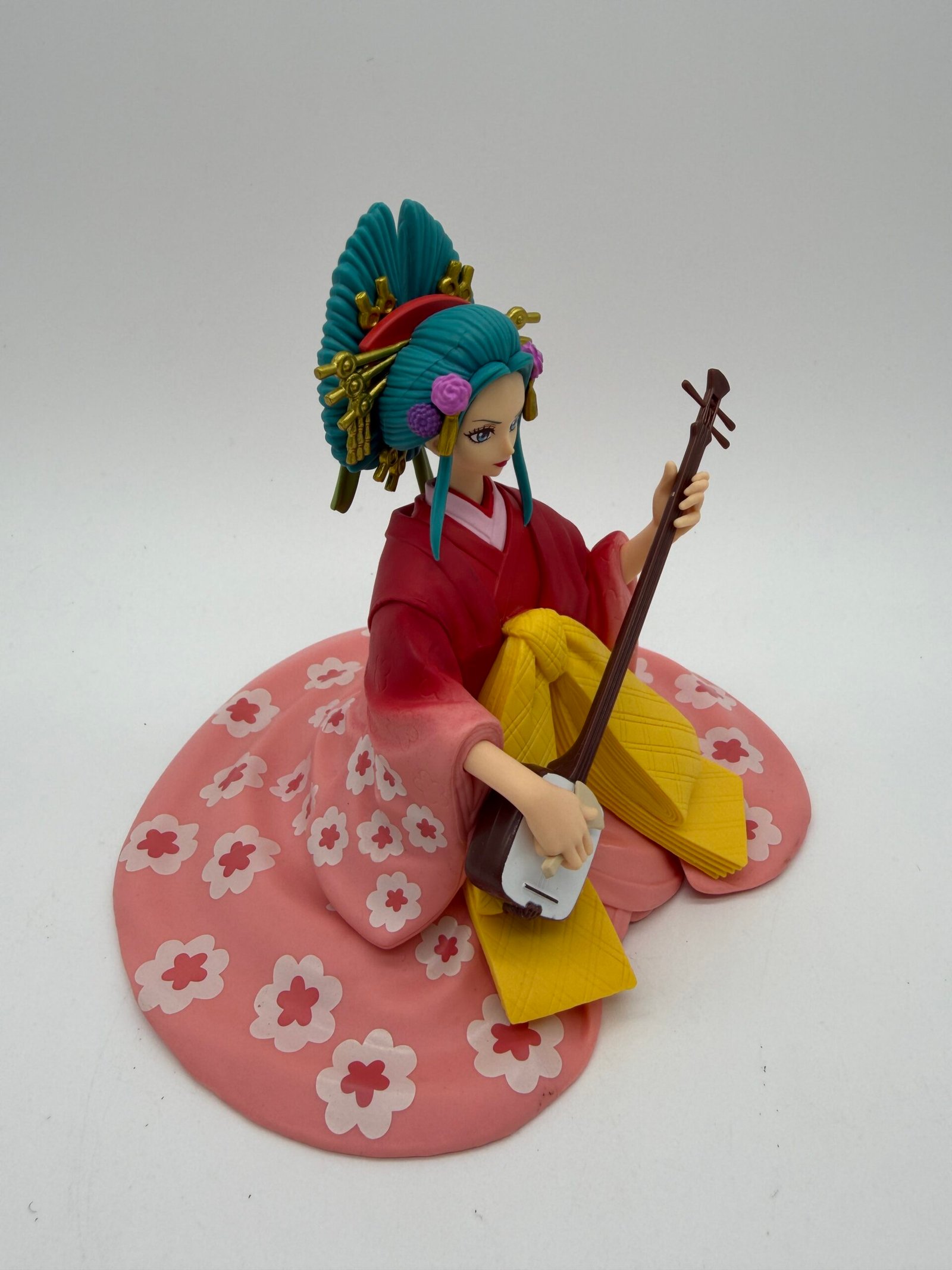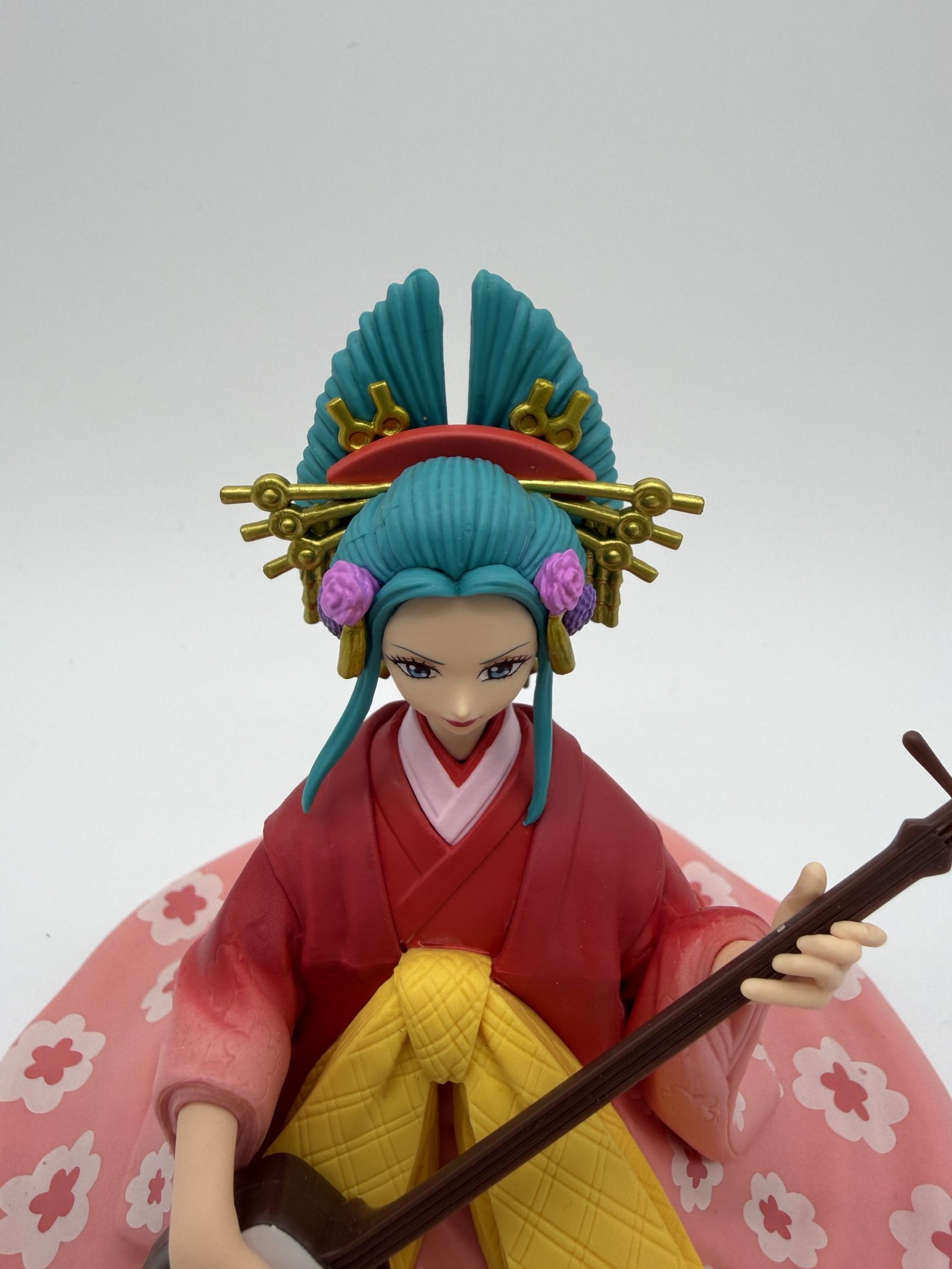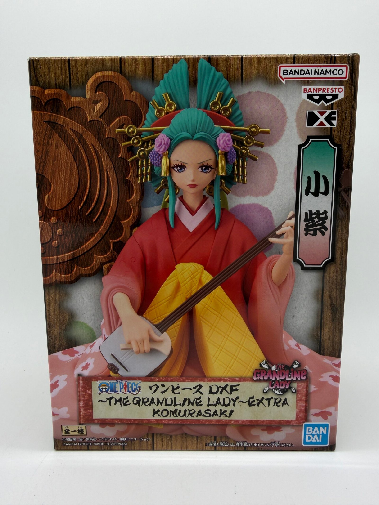 La figura de Banpresto presenta a Komurasaki, también conocida como Kouzuki Hiyori, tocando su Shamisen con una gran elegancia. Parte de la línea DXF The Grandline Lady Extra, es una pieza destacada para los coleccionistas de One Piece.