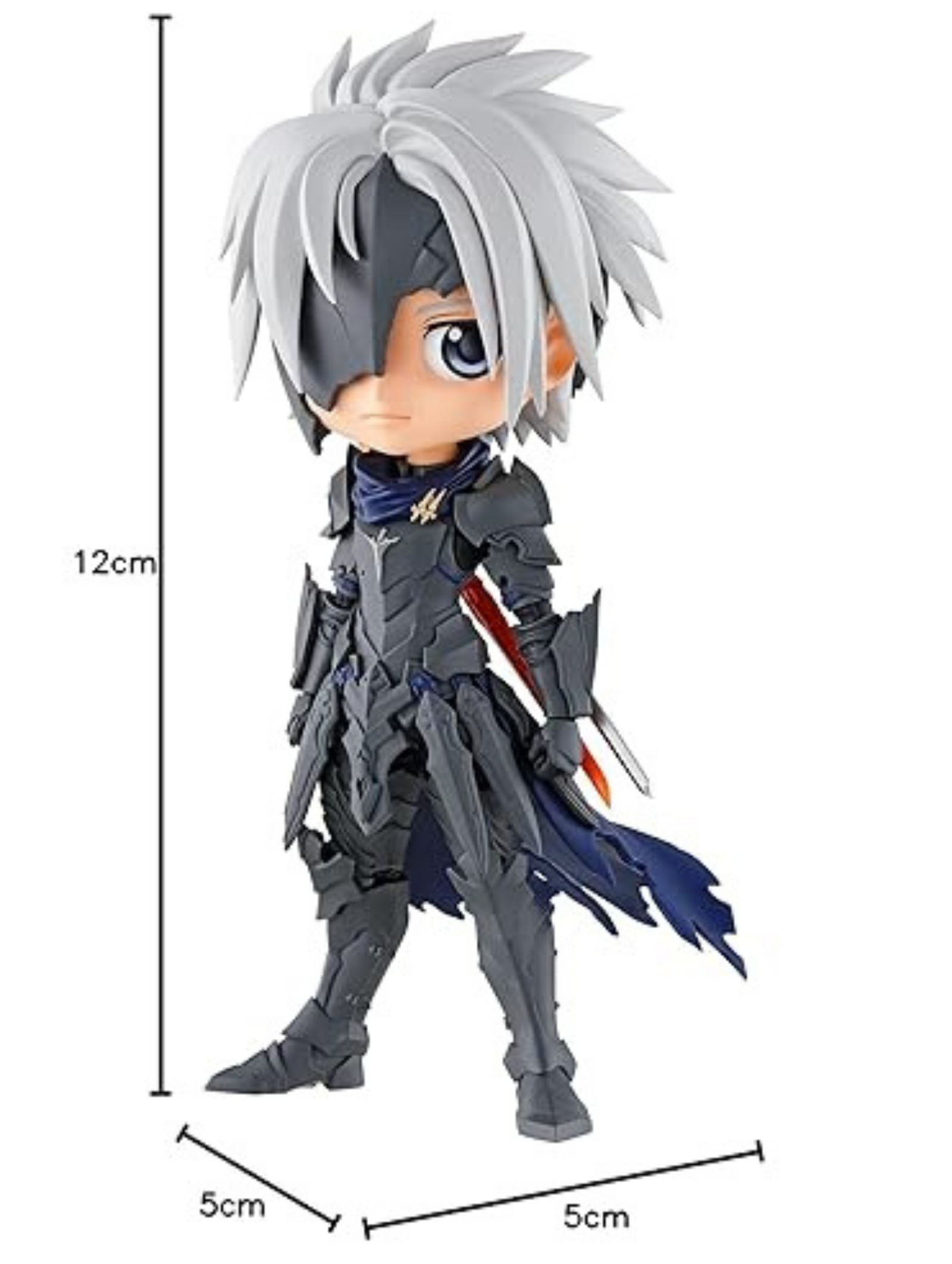 Banpresto presenta a Alphen de Tales of Arise dentro de la línea Q Posket, en la Versión A, con el esquema de color original y oscuro del personaje, destacando su característica máscara de hierro y su cabello plateado. Un diseño estilizado que refleja fielmente la estética del protagonista del videojuego.