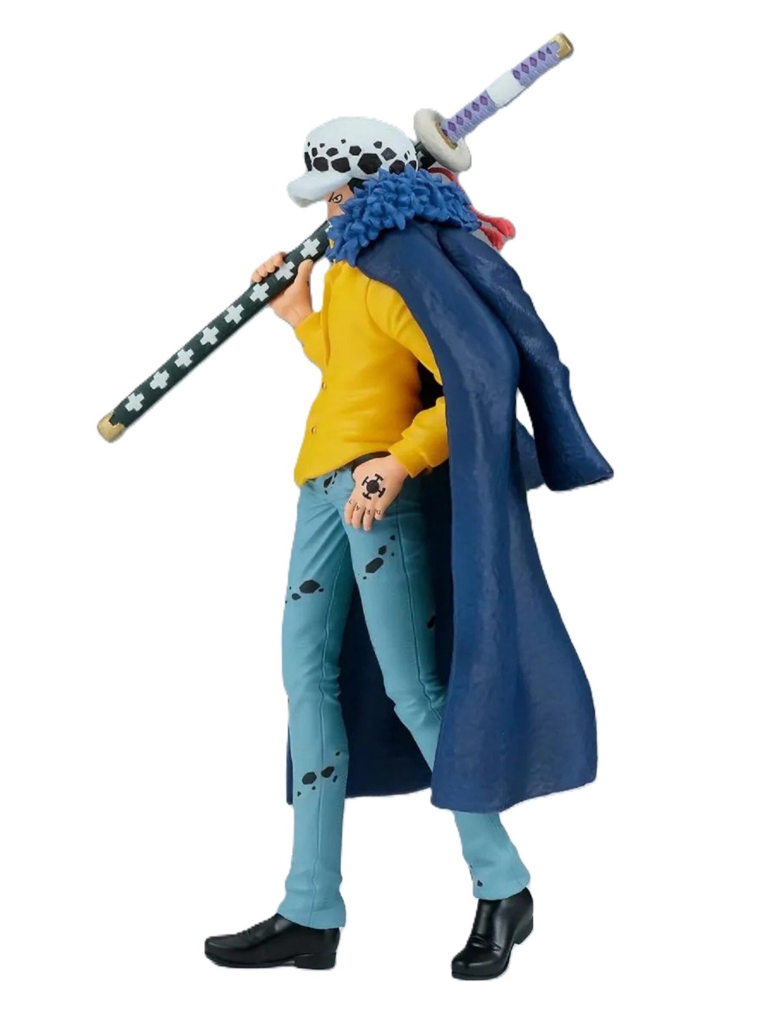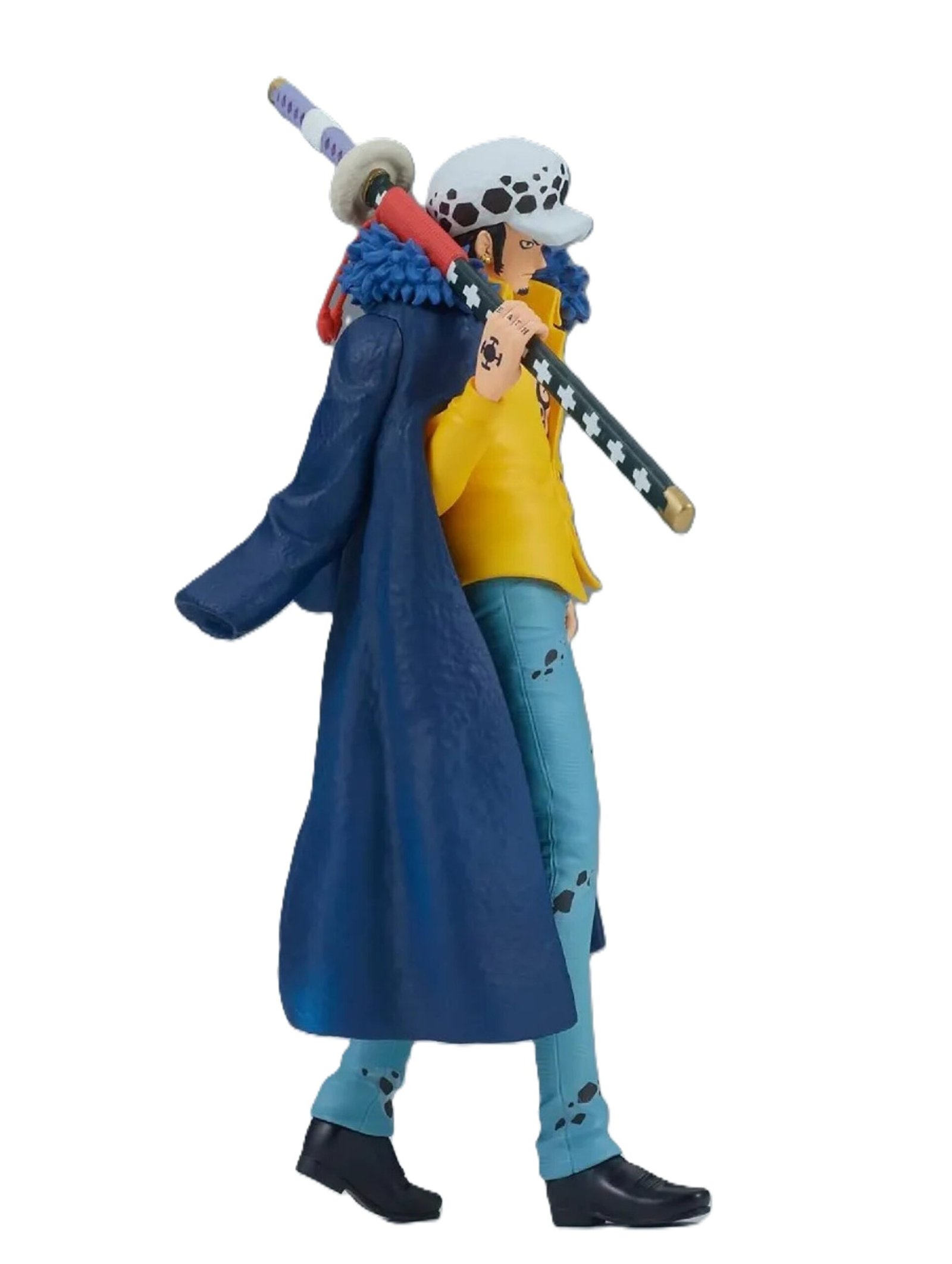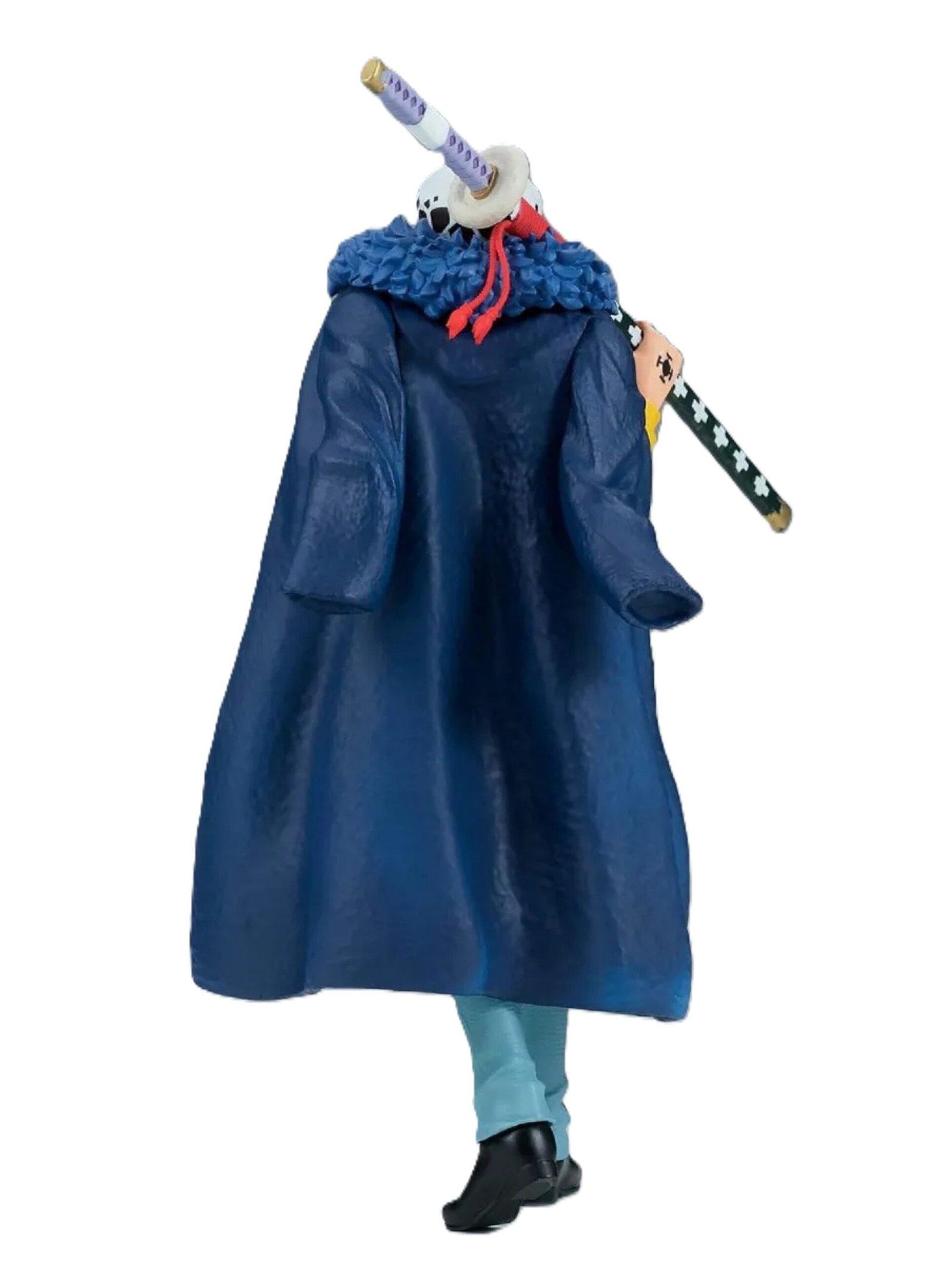 La figura de Banpresto de la línea The Shukko, presenta a Trafalgar Law con una pose inquietante y elegante que captura su personalidad calmada y calculadora, siendo una pieza ideal para los fanáticos y coleccionistas de One Piece.